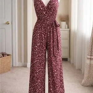 Chic maroon jumpsuit with floral pattern. Features a flattering design and tie waist. Ideal for versatile styling.