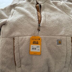 Warm and cozy fleece jacket by Carhartt. Features cream body with brown accents. Ideal for cold weather.