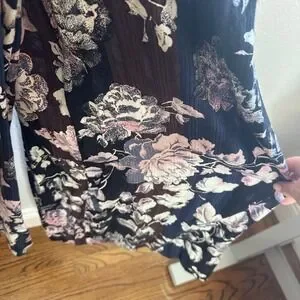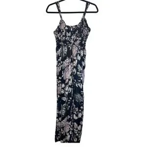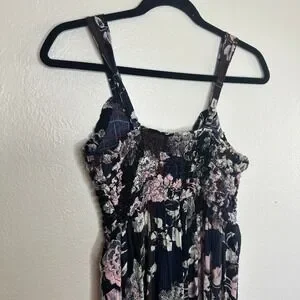 Free People floral print smocked waist maxi dress in black with pink accents. This dress features a flattering smocked bodice, adjustable spaghetti straps, and a flowing maxi skirt. Perfect for a casual day out or a vacation getaway.