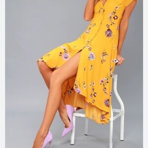 Women’s Free People “Lost in You” midi dress in a bright yellow floral print. Features a flattering V-neckline, short sleeves, button-front detail, and a flowy, feminine silhouette with a front slit.