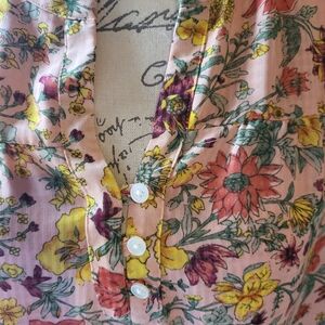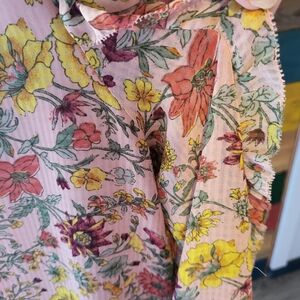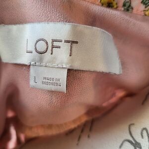 Lightweight and feminine LOFT floral blouse in a soft blush pink with yellow and green floral print. Airy, semi-sheer fabric with a relaxed drape—perfect for work or everyday wear.
