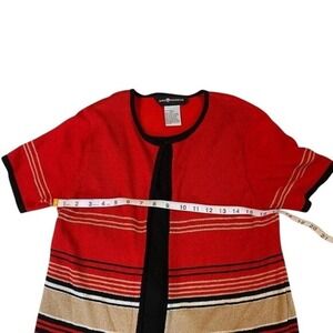 Elevate your wardrobe with this captivating SAG HARBOR knit cardigan top combination. Designed to offer both style and comfort, this piece features a vibrant red base beautifully accented with bold black and sophisticated beige stripes. The short sleeves and open front create a flattering silhouette that layers effortlessly over your favorite tops. Imagine yourself enjoying a casual brunch with friends or heading to a relaxed afternoon outing in this chic and versatile top.