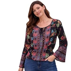 Beautiful boho-inspired floral blouse for women in size Small. This stunning top features a black base with colorful floral and ethnic patterns, creating a true bohemian chic look.