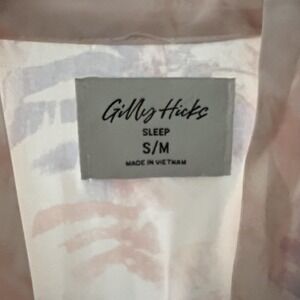 Brand markings: Gilly Hicks Sleep woven neck label marked S/M and Made in Vietnam; tonal Gilly Hicks embroidery at front; interior care/content tag with RN 13564 and CA 50316 and safety message "KEEP AWAY FROM FIRE"; style/production codes 51038179122 and 01400445 printed on interior tag