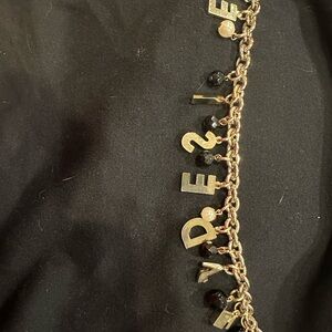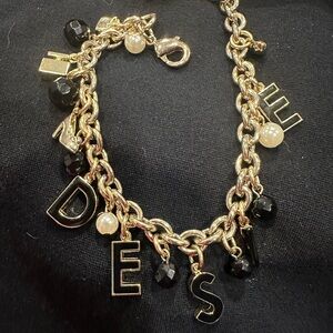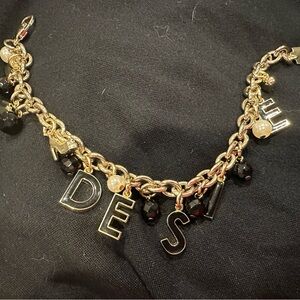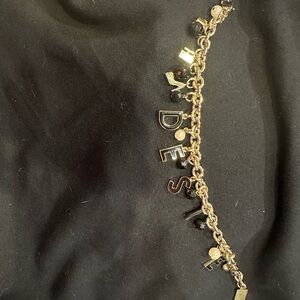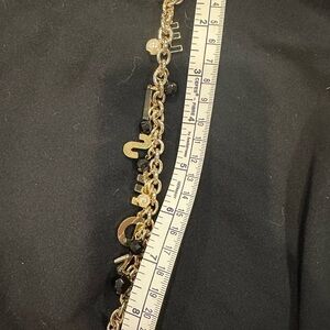 Letter R is missing. Elegant bracelet with gold chain and black charms. Features Dolce & Gabbana logo.