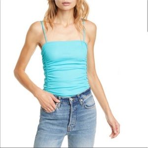 New without tags. Size small. Square neckline. Ribbed texture. Skinny adjustable straps. Ruched sides. Full coverage bottom.