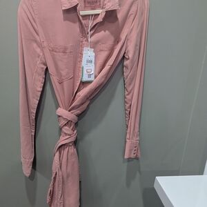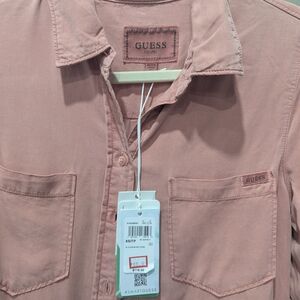 Stylish pink button-up shirt dress by Guess. Features a classic collar and front pockets.