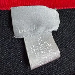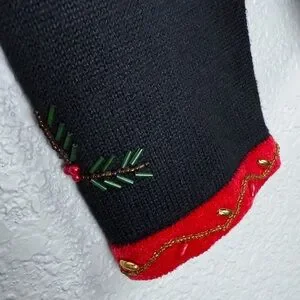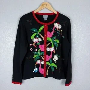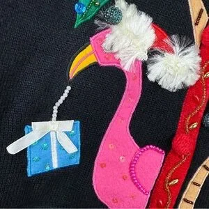 This rare vintage Berek women's cardigan sweater in black is a festive and fun knit featuring tropical flamingos and palm trees adorned with beaded, sequined, and embroidered holiday embellishments. The quirky Christmas design includes hanging ornaments and a variety of decorations, making it a unique statement piece for the season. Embroidery on the back as well. Preloved, size Medium.