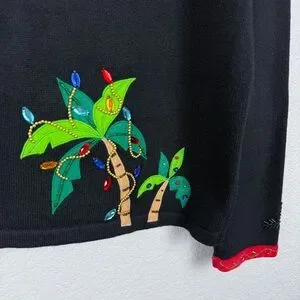 Tags: beads, sequin, embroidered, embroidery, felt, fluff, faux fur, trim, Christmas lights, xmas, holiday, holidays, red, green, pink, black, blue, white, buttons, peppermint, candy canes, holly, santa hats, palm tree, palm trees, Hawaii, Hawaiian, tropics, brown, stocking, stockings, ornaments, gift, gifts, present, presents, beach, beachy, party, celebration, Florida, ocean, sea, summer, decorations, gathering, holiday photo, ugly Christmas sweater, ugly sweater, kitschy, Christmas cardigan, novelty, beachside, berries, colorful, multicolor, bead, sun, sand, warm winter, 1990s, 90s, nineties, vintage Christmas sweater, medium, knitwear, throwback, fun
