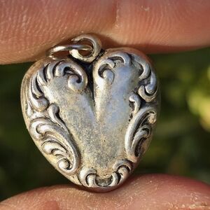 Lovely Victorian revival heart with ornate repousse scrollwork. Jump ring bale. Antiquated look with patina. Puffy look. Plain on the reverse. Not sterling silver.