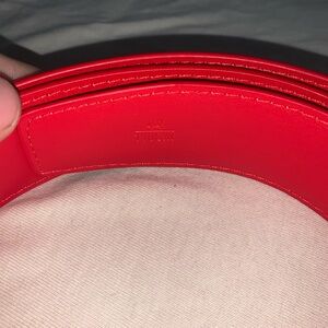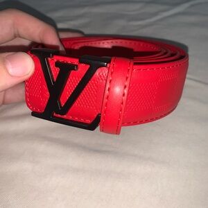 Stylish red belt with iconic black LV buckle. Perfect for a bold fashion statement.