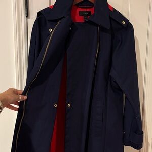 J. Crew navy blue rain coat featuring bold red accents. Perfect for a chic look. Size M
