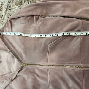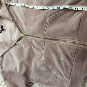 Soft dusty rose pink with gold zipper & front pockets. Cropped fit, super cozy and perfect for layering. Bust: ~18”, Length: ~19”.