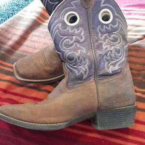 Good pair of brown and purple leather boots. Square toes. Mid calf. These are in used condition but still a great pair of boots. Size 4.5 from Ariat.