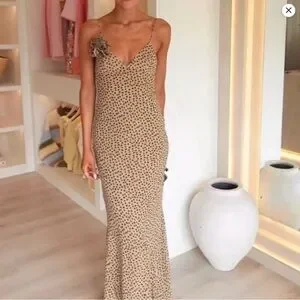 Elegant maxi dress with black dot pattern. Spaghetti straps and fitted design. Perfect for evening wear.