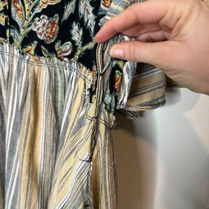 •Color: Black Combo - a black floral bodice with yellow, ivory & gray striped skirt