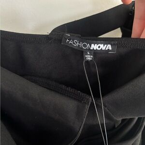 Turn heads in this stunning black maxi dress from Fashion Nova. Featuring a sleek one-shoulder neckline with a bold cutout detail and a sultry thigh-high slit, this dress is made to flatter and make a statement. The fabric has a smooth, body-hugging fit that looks amazing for formal events, nights out, weddings, or special occasions. Brand new with original tags attached.