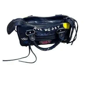 This motorcycle-style tote bag fits casual urban settings and requires light care to maintain printed embellishments.