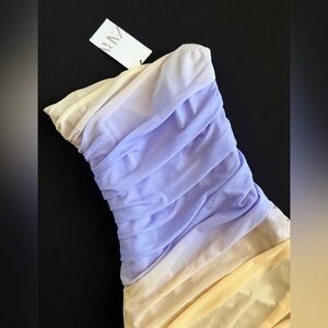 Beautiful strapless dress with a gradient design. Features shades of purple and cream.