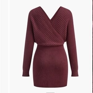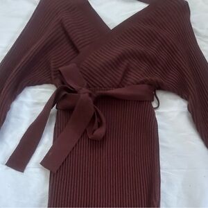 Chic deep burgundy/brown mini dress. Features a V-neck and long sleeves. Stretches to fit your body, very flattering. Cute with boots or heals!