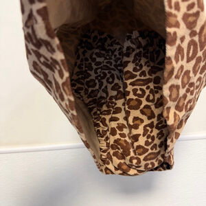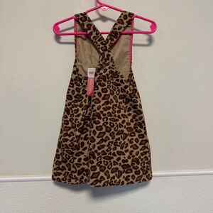 This is a new with tags Gymboree girls' casual dress in size 18-24 months, featuring a brown and beige leopard print. The dress has a sleeveless design with criss-cross straps at the back, secured by a single button. A small zipper is visible on the left side. The fabric appears to be 100% cotton, as indicated on the tag, and includes a matching leopard print bloomer or diaper cover. A spare button is attached in a small plastic bag.