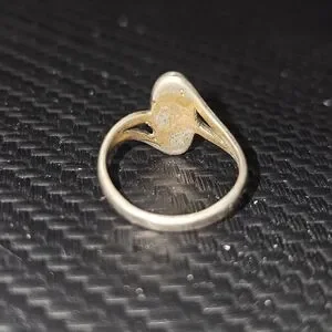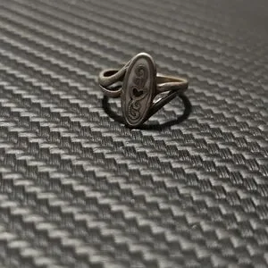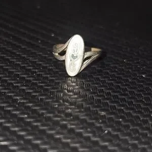 Vintage silver oval ring with silver heart scroll design inlaid in cream and turquoise enamel. Estimated size 3 based on 14mm diameter