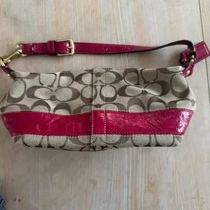 Excellent vintage condition. Coach 2008 Legacy Cursive Creed Limited Edition Canvas Leather Pink Stripe Demi. Elevate your style with the Coach Signature Canvas Shoulder Bag. Featuring a chic pink and tan design, this bag is perfect for any occasion. Enjoy the blend of fashion and functionality with Coach's iconic craftsmanship. 8x5.5x3.