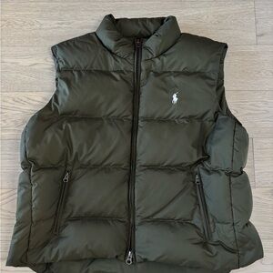 Classic olive puffer vest by Ralph Lauren. Features zip closure and side pockets. Ideal for layering. Men’s size medium Slim fit Very good condition Little to no sign of wear