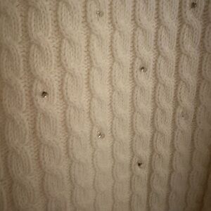 Elevate your wardrobe with this sparkly, chic, (VINTAGE-90’s) ivory/cream cable knit cardigan. Rhinestone style buttons and scattered rhinestone embellishments (aka Bling ✨).