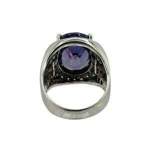 Stunning Sterling silver and faceted Sapphire wide ring. This has a large faceted purplish blue sapphire ring with rows of sparkly CZs. This is in a wide statement setting! There is a tiny dent on the side of the band