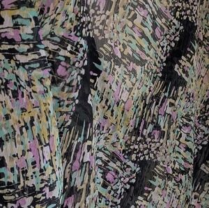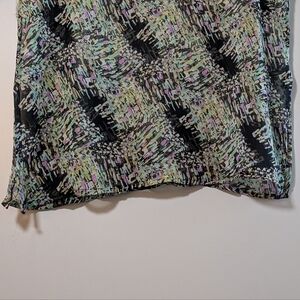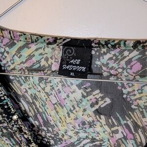 Features: Art deco sheer tunic with beaded neckline, abstract print, and flowy 3/4 sleeves. Size XL, elegant and lightweight.