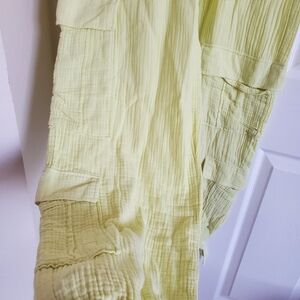 Pants feature wide elastic waistband, front pockets, front thigh pocket, side pockets, pockets at calf area too drawstring ankles