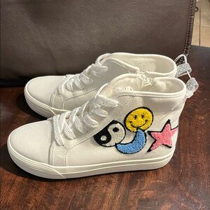 Stylish white sneakers with fun patches. Features smiley face, star, and yin-yang designs. Comfortable and trendy for kids.