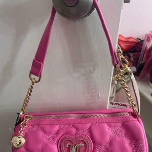 Vibrant pink clutch with heart logo detail. Elegant and trendy design. Ideal for any occasion.
