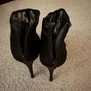 Step out in style with these elegant black lace stiletto heels. Perfect for any occasion, these shoes offer a sophisticated touch to your outfit! They feature a peep toe with lace going up to the ankles, a small zipper closure in the back for easy on and off, and satin detailing, including on the platforms!