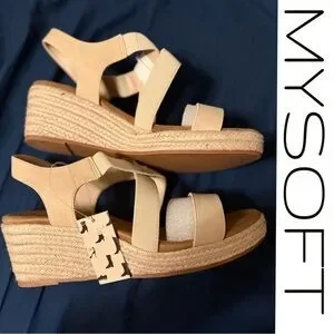 NWT MySoft Beige Cream Brown Feminine Elastic Strap Wedge Sandals – Size 11