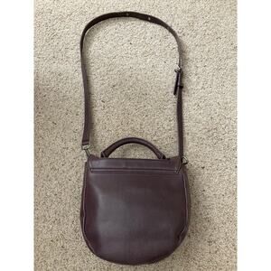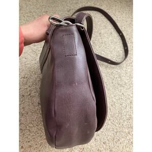 Matt & Nat Medium size plum, purple leather crossbody purse. The bag has flap and magnetic closure. The bag also has a single handheld strap. The crossbody strap is adjustable. The leather is adjustable. The inside is brown lining. Inside there is one slip pocket and one zip pocket. The inside and outside are in good conditions. The inside and outside is clean. Approximate measurements are 10 X 10 X 3.5 inches. Crossbody strap length at longest is 23 inches. The strap has 5 adjustable notches.