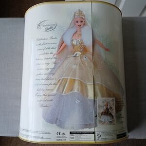 back of box says; "Celebration Barbie is the first in a new series of dolls that symbolize the holiday spirit of the 21st century. She is stunning in a golden and ivory dress that defines a new elegance for the holiday season. Enjoy this special moment with Barbie!"