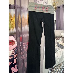 Victoria Secret VS pink Black boot cut htf rare yoga leggings/pants with fluorescent hot pink neon & silver chevron stripe logo bling on the fold over waist #supermodelessentials vsangel lovePINK