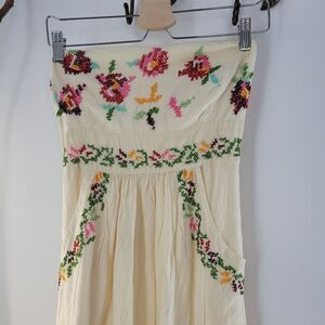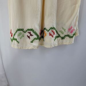 sunny yellow with colorful embroidery. strapless with pockets. handmade in Indonesia. Preloved condition. All sections of interest as well any known flaws have been documented in the photos and noted as thoroughly as possible. if there are no known flaws, none will be noted. Please feel free to ask any questions before purchase 🙂.