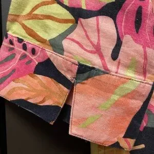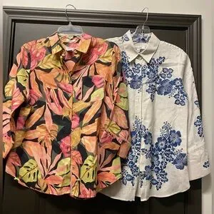 Chico's No-Iron FreshChic linen button-up shirt with a tropical leaf print.