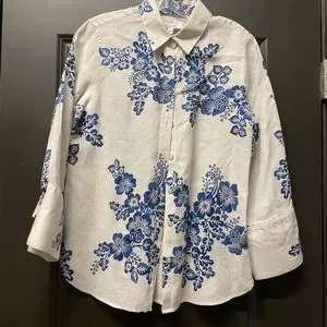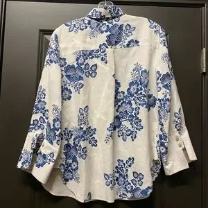 Chico's No Iron Linen 3/4 sleeve floral shirt in blue and white.