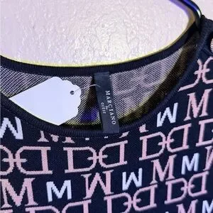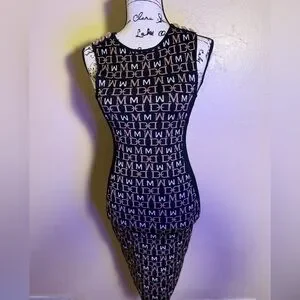 Chic midi dress with bold logo pattern. Perfect for casual outings.