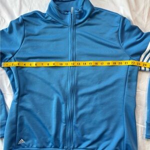 Vibrant blue jacket with white accents. Features a comfortable fit and classic Adidas design. Potential snags in the jacket (visible in images) and all measurements in images.