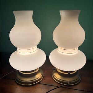 Set of 2 hand painted milk glass laps. Glass shades sit on brass ring base.