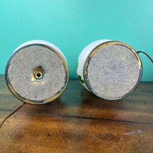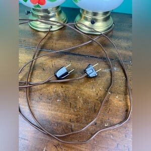 In perfect working order, cords had no fraying or wear. One plug may have been replaced at some time. The metal base has wear, patina, surface loss. Shades have no chips or cracks and very minimal paint loss if any.