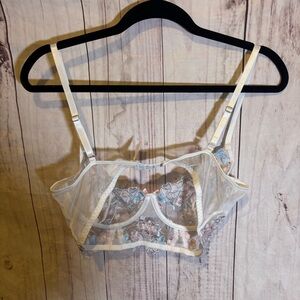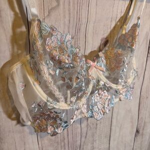 This elegant sheer bralette features intricate floral embroidery in pastel hues. Perfect for adding a touch of luxury to your intimate collection.