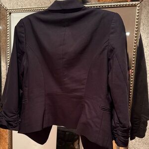 Elegant black blazer. Features ruched sleeves. Perfect for formal occasions.