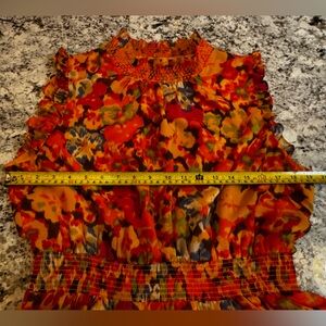 Eye-catching floral pattern. Features ruffle accents. Perfect for a lively style.