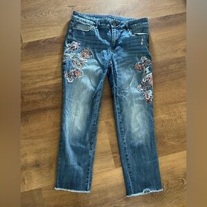 White House Black Market Floral Embellished Embroidered Blue Cropped Jeans. Stylish blue jeans with elegant floral embroidery. Perfect for a chic and casual look. From smoke and pet free home. Size 6